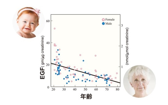 GFは私たちの体内にもともと存在するタンパク質の一種。すべての細胞増殖・抑制をコントロールし、肌の生まれ変わりを司っています。20代前半以降、体内のGF分泌量は激減し、それに従って様々な年齢サインが現れるように。つまり、GFの分泌量が肌老化の進行に深く関わっているのです。